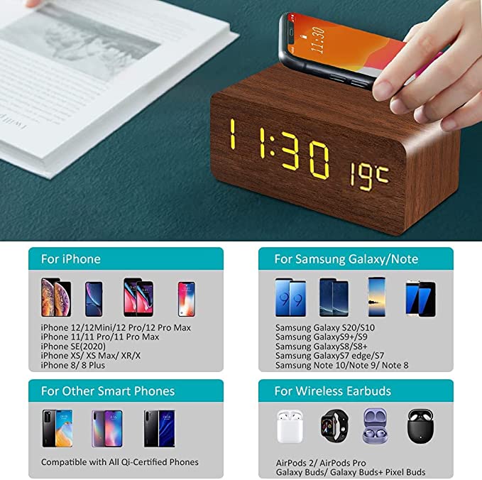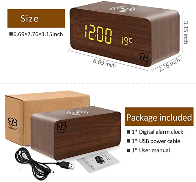 About this itemn【Wireless Charging With Alarm Clocks】 – Bluebell digital table clock Support QI Certified Wireless Charging cellphone models. It provides convenience for you to place and bedside table charge your phone at the same. It’s perfect for those who forget to charge their mobile.n【Multiple Alarm Setting 】- This digital clock for Study table Updated in 2021 from dual alarms to three alarms clock for heavy sleepers, in this digital clock with light, set two or three alarms to better WAKE you up. One for you and the other for your families. Forever Say no to delay. Also, it allows you to set weekday mode, which will ring only on Monday to Friday.n【Stylish Wooden Design for Decor】- This Smart digital clock with alarm must be the most delicate small clock you’ve ever seen. It’s not only a clock It’s also a good choice for a table clock for home decor, great decoration for your bedroom. Stylish appearance and multiple functions make it suitable as gifts for Your Wife, Husband, Kids.n【3 Brightness Level Adjustable】- This led alarm clock Allows you to adjust from low to high brightness, or even turn off the LED light and keep it sound sensitive. It’s a user-friendly at-night clock for bedroom, which won’t be too harsh for your eyes. It’s a great alarm clock for boys.n【Power Cord Operated】- This led digital clock with a wireless charger is operated by USB digital Clock to barrel power cord and battery-operated alarm clock. ***Batteries are NOT RECOMMENDED*** It drains batteries REALLY fast! Batteries are only for testing purposes or temporary use. Best Study table clock for Students.