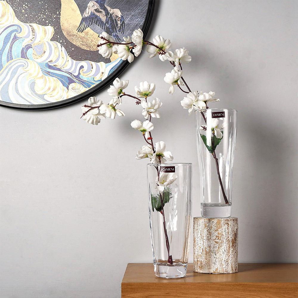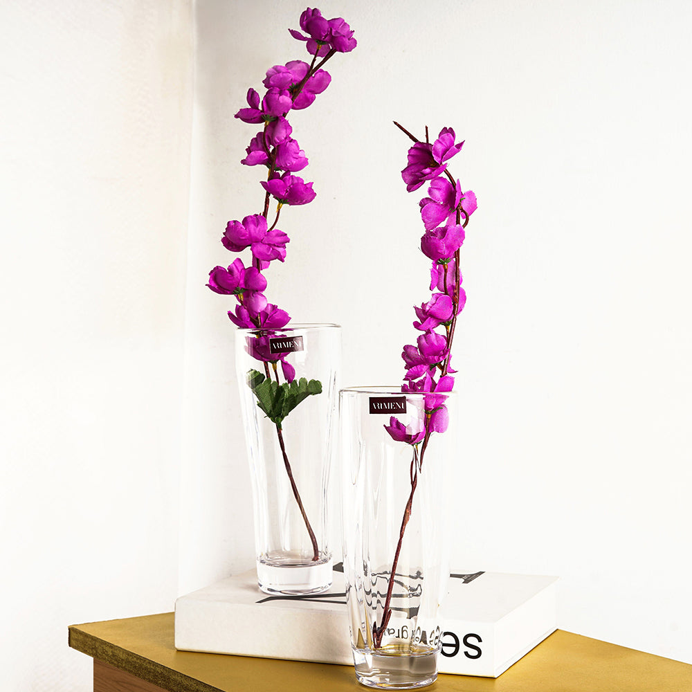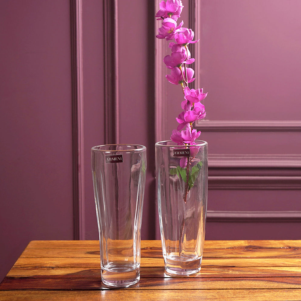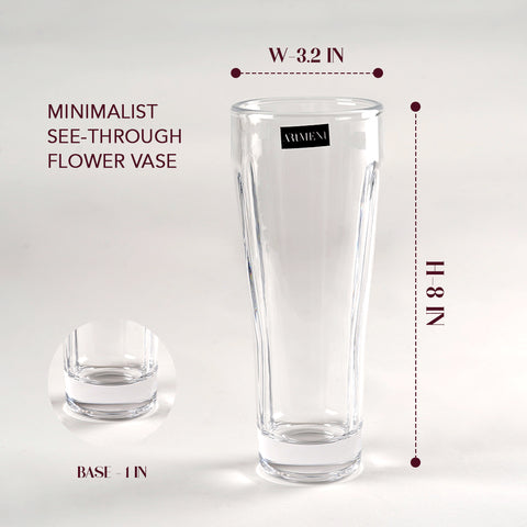 After every use, wash it with normal tap water, and clean it dry with a cotton cloth. Do not use it in a dishwasher.nHandcrafted by Indian craftsmen, this glass vase is simple and delicate and lets the flowers in them shine, while taking a backseat. nThis glass vase set of 2 measures 8 inches by 3.2 inches. It has a 1 inch thick base, that prevents any seepage or slippage.nThe vases are sent individually wrapped triple layering of bubble wrap and safely packed in a box.nThese glass vases can be used to decorate your home, offices, or cafes. It is also ideal for gifting.nThe Minimal See-Through Flower Vase is part of our minimalism collection. They are made of the finest glass, handcrafted by Indian glassmiths. Slender, subtle, and sleek, this vase pair will be the ideal accompaniment for vibrant flowers. These gorgeously shaped vases can easily hold long-stemmed flowers.