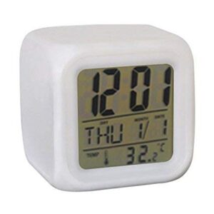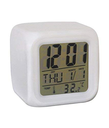 About this itemnALARM CLOCK FOR TABLE 04 Information on the Screen Time, Date, Day & Temperature. The Backlit display features time, date and temperature while the translucent case glows with 7 different colors.nDIGITAL CLOCK LCD Digital Display With Green Back-light | Auto On-Off of Back-Light | Alarm With Music | Snooze FunctionnSMART ALARM CLOCK All the functions can easily be set with easy to use buttons, Once LED color can also be set permanently as per your choice. Ideal to put on side table or display box. Ideal to carry while traveling.nLED COLOR CHANGING CLOCK This light weight clock is ideal gift for kids, family, friends or for corporate gifting. For kids, different kids sticker can be pasted on its side walls to make it more beautiful. While corporate can put their branding on the clock before gifting it to staff, or business clients.nTABLE CLOCK Fully Operated With 3 AAA Batteries (Not Included) | Can Also be Operated With AC Adapter (Not Included) | 2 Button Cells are provided to operate only clock function | Dimension – 7.5×7.5×7.5 CM